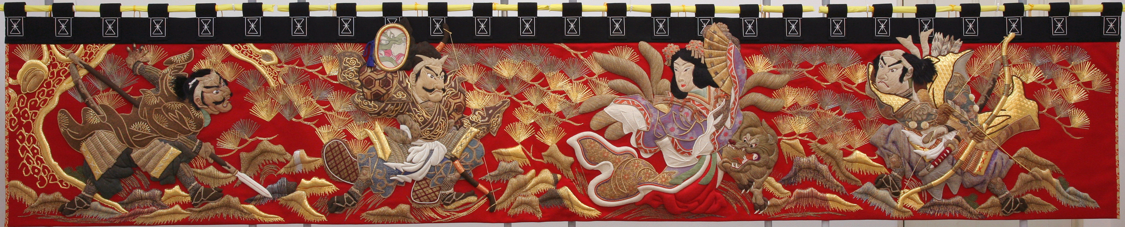 昭和30年に淡路島の津名郡生穂町(現・淡路市生穂)のだんじり業者「大歳」によって制作された水引幕です。大歳は元々は造り酒屋でしたが、大工職人や金具職人、刺繍職人を呼び寄せて、だんじりの製造を一手に引き受けていました。戦後、大歳は、播州の「絹常」で働いていた刺繍職人を数名招いて、四国系の刺繍を意識し、絹常流の御殿の入った純金糸縫い潰しの飾り幕をいくつも制作しています。人物の顔の表情や衣装の縫い方には絹常の特長が色濃く感じられます。その中で本作品である、「桶狭間の戦い乃図」は大歳、最後の作品だといわれており、たいへん貴重な水引幕と言えます。